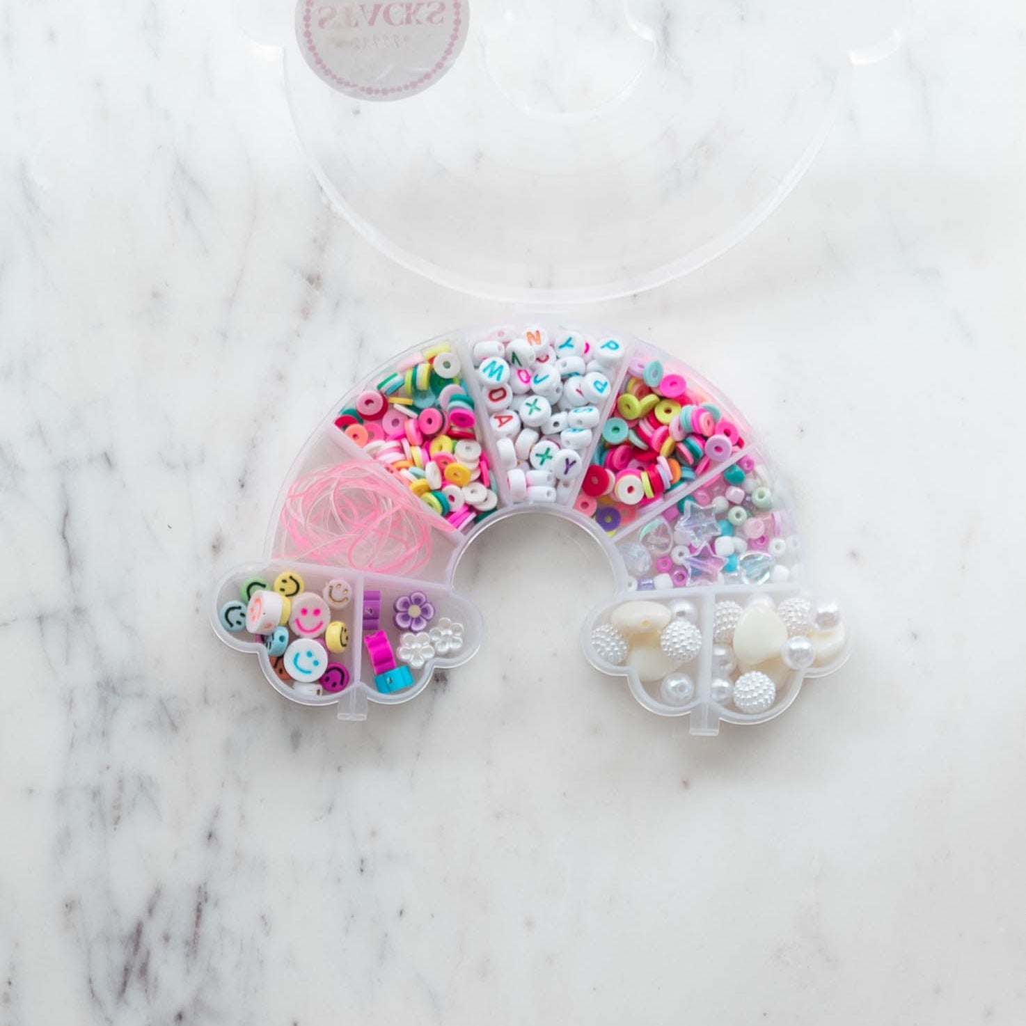 Our Over the Rainbow Bead Kit comes with a variety of beads to create your own bracelets or necklace. This kit features rainbow alphabet beads, clay beads, iridescent heart and star beads, white disco pearl beads, flower beads, happy face beads, and pink and clear string.