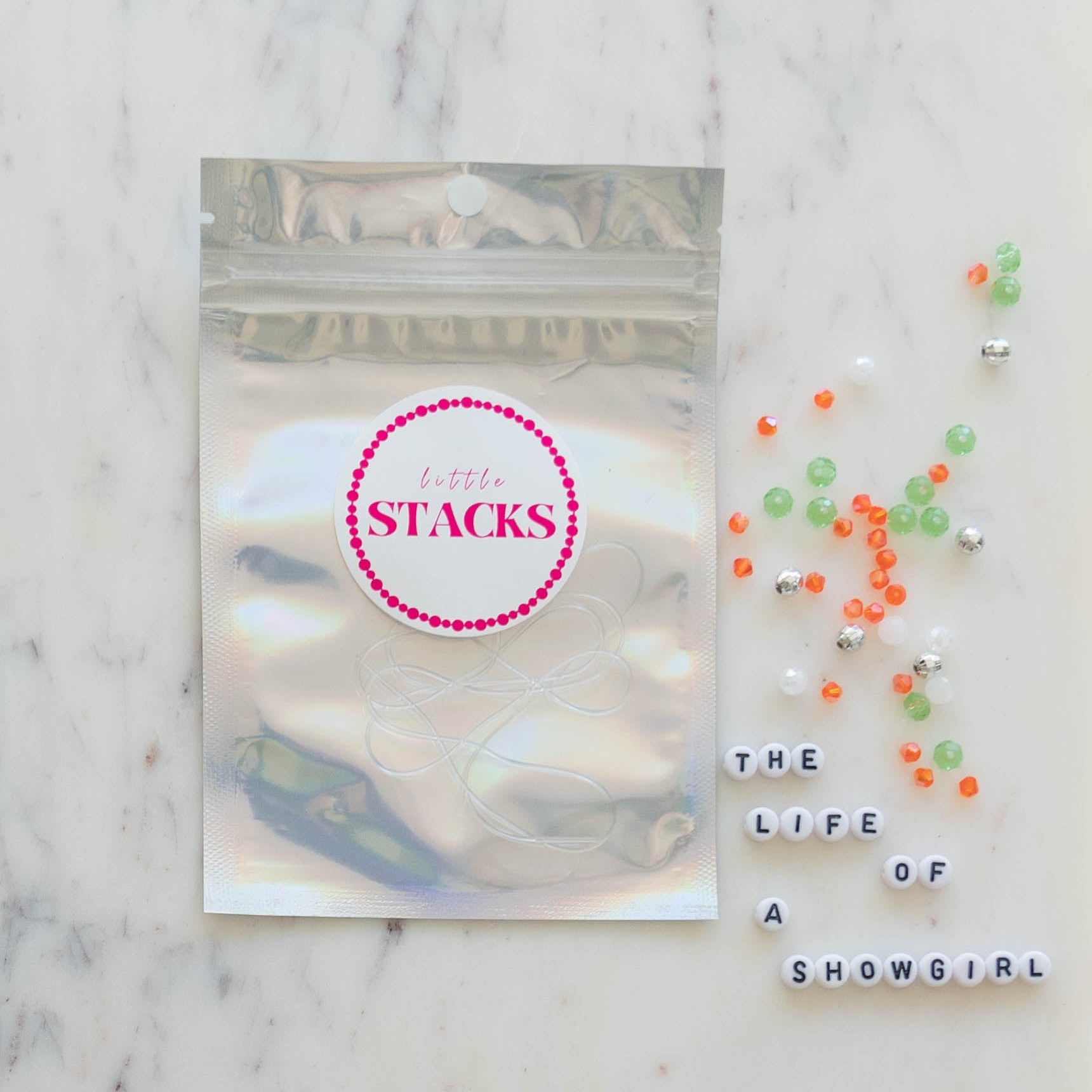 Our The Life of a Showgirl Kit features: orange crystals, mint green crystals, disco ball beads, and more!